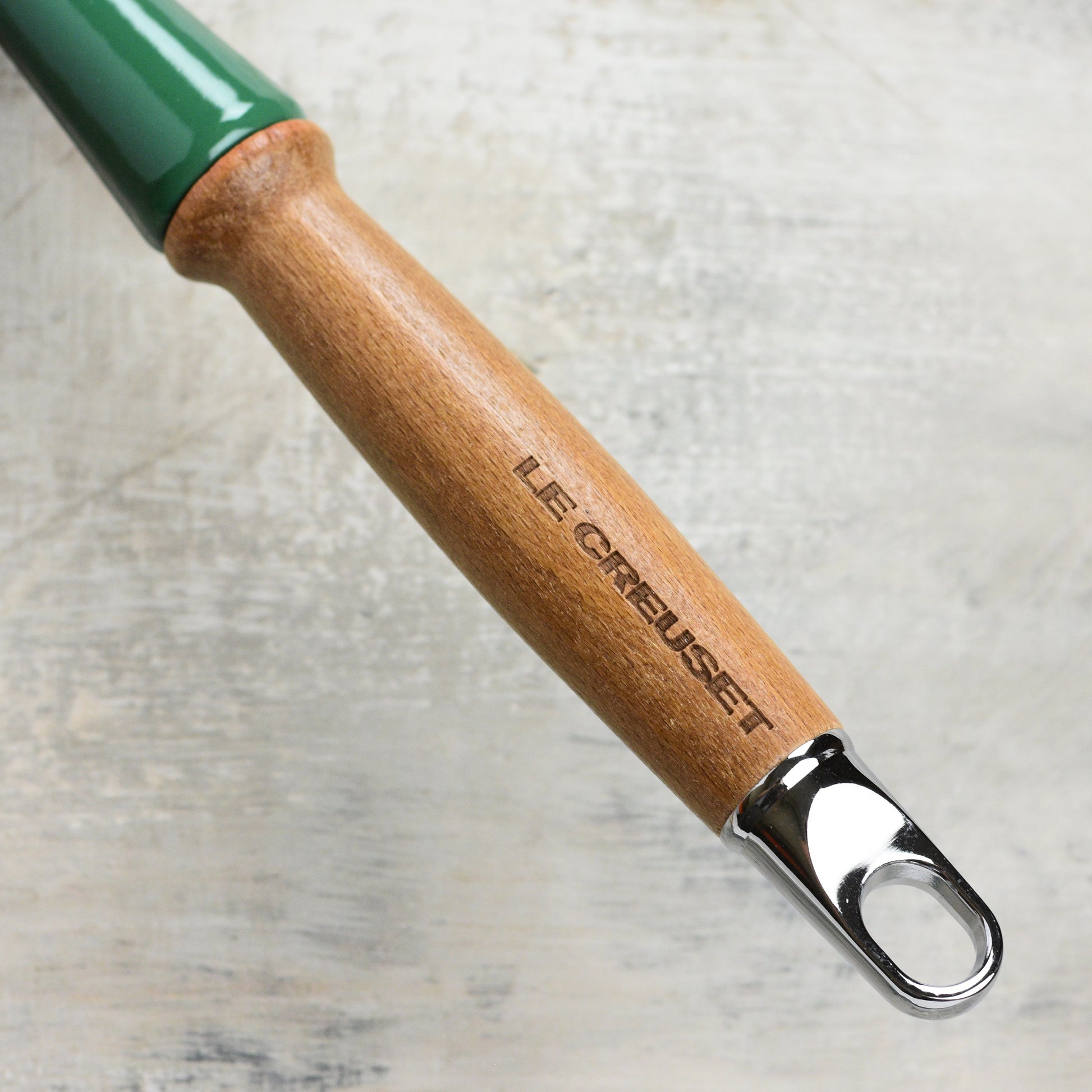 - Ergonomic, durable maple-stained beechwood handle stays cool to the touch; designed for easy lifting from stove to table