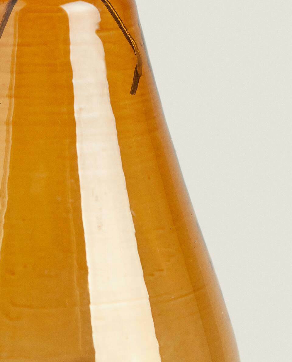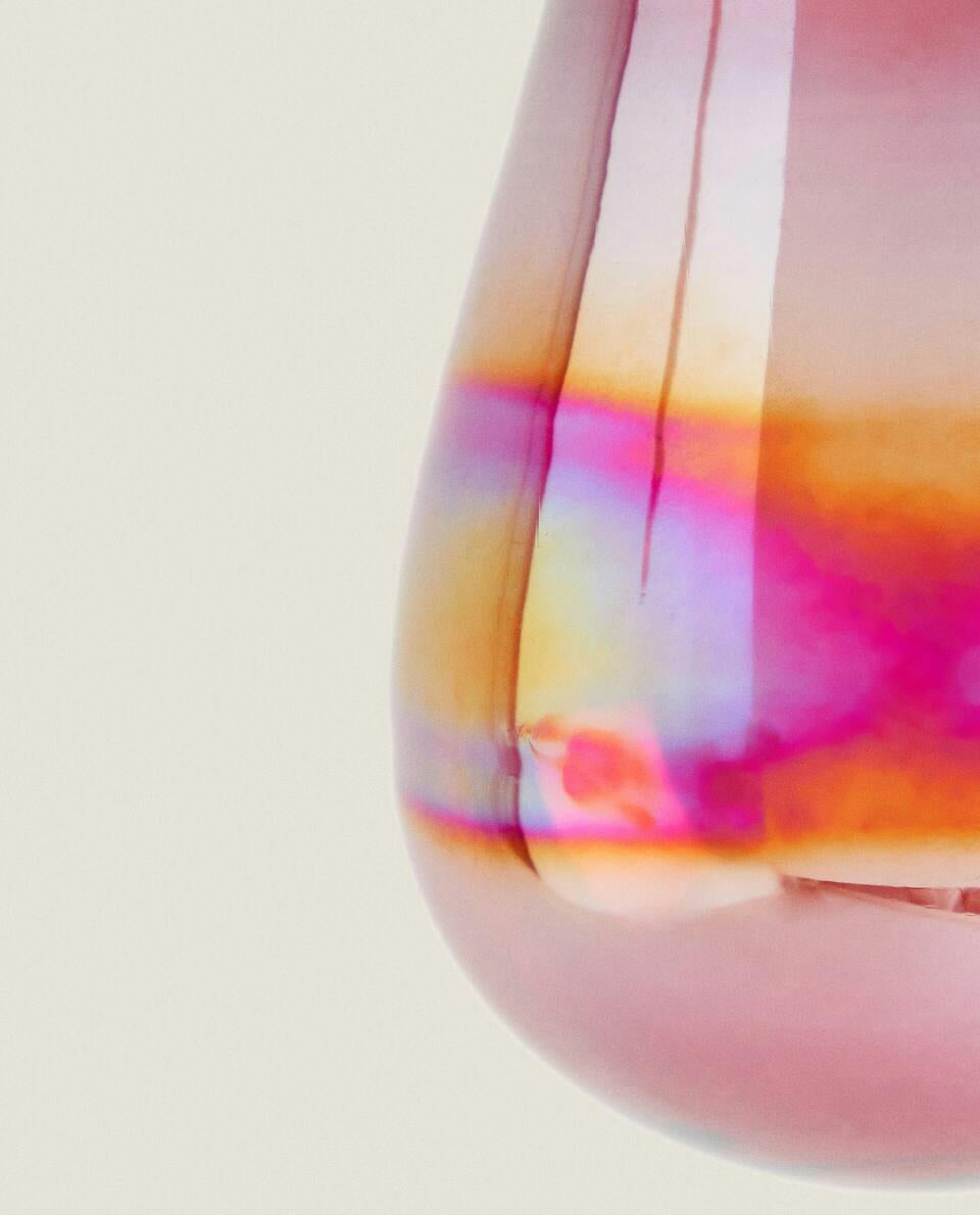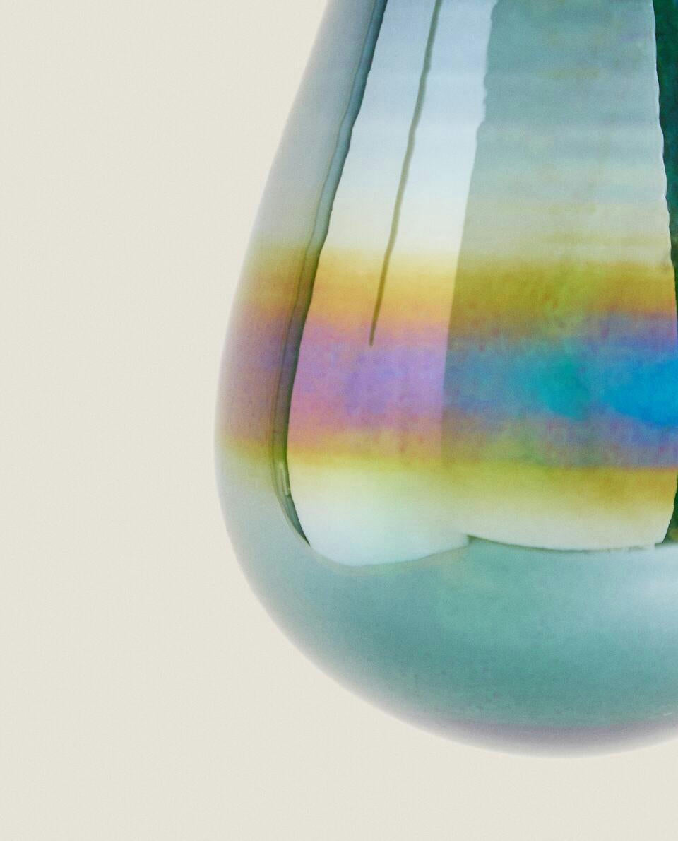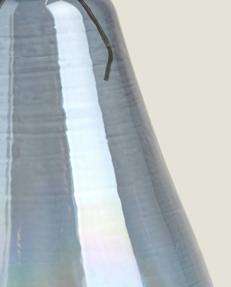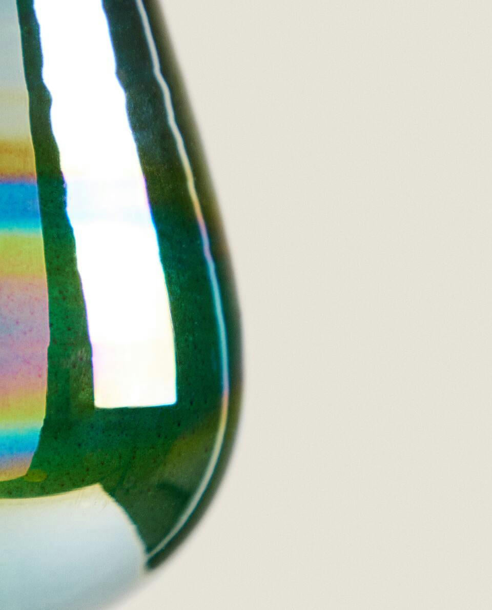 Glass Christmas tree decoration in the shape of a pear with a velvet ribbon for hanging.
