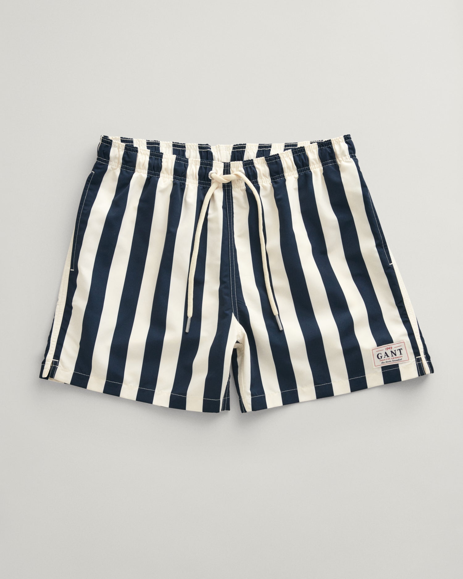 These classic swim shorts are crafted from recycled polyester and cut for a regular fit. Featuring a woven label at the leg, the mid length design is constructed with an elasticated waistband and a contrast-colored drawstring for premium style and comfort. Fashioned with a seasonal block striped pattern, the shorts also include convenient side seam pockets and a single back pocket.