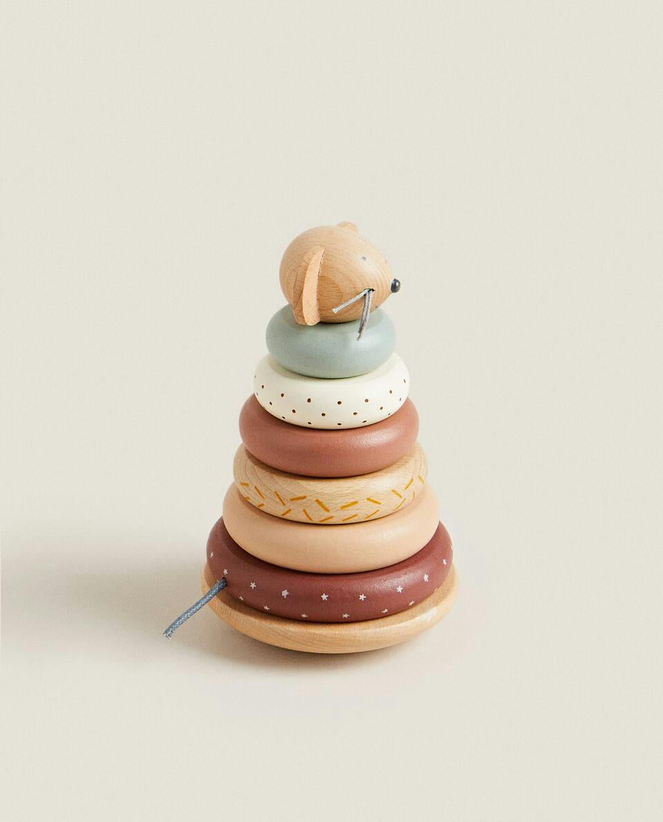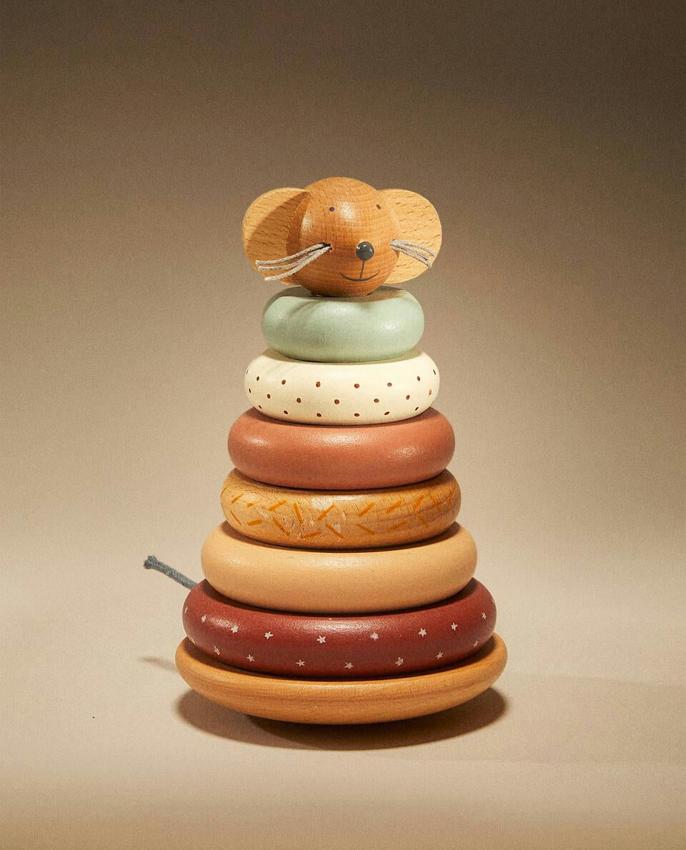 Wooden toy with a mouse-shaped head with whiskers for stacking pieces and creating a variety of patterns. It stimulates the development of children's senses and motor skills.