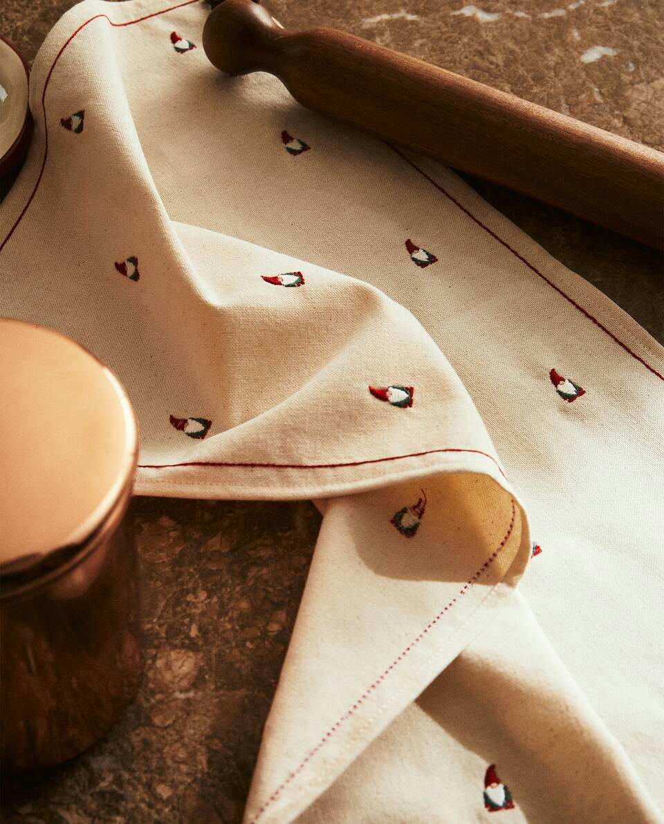 Cotton Christmas tea towel with embroidered gnome motifs.