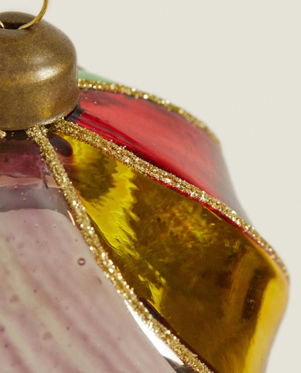 Christmas tree bauble decoration made of glass, with multicoloured spiral stripes and glitter. Featuring a velvet ribbon for hanging.