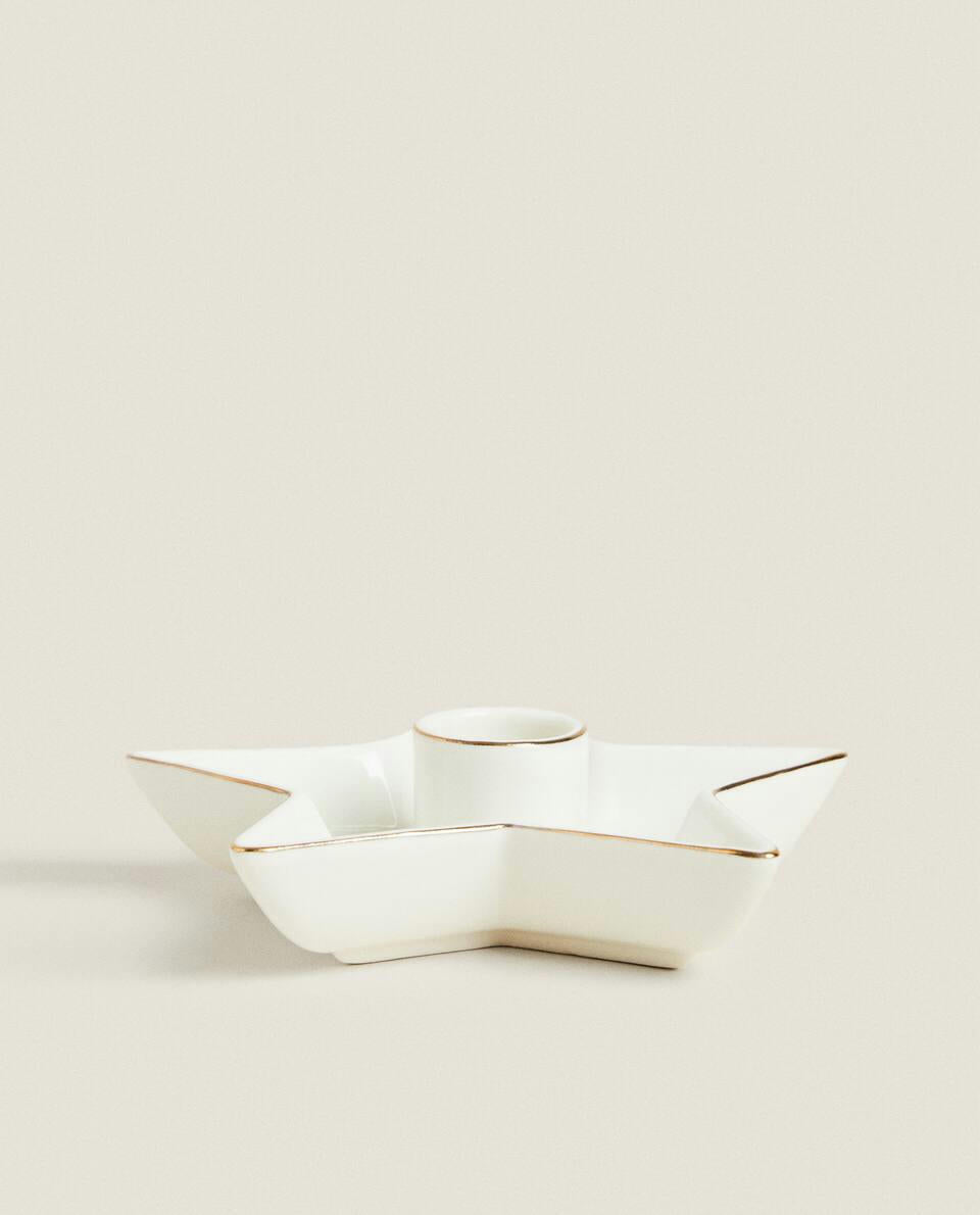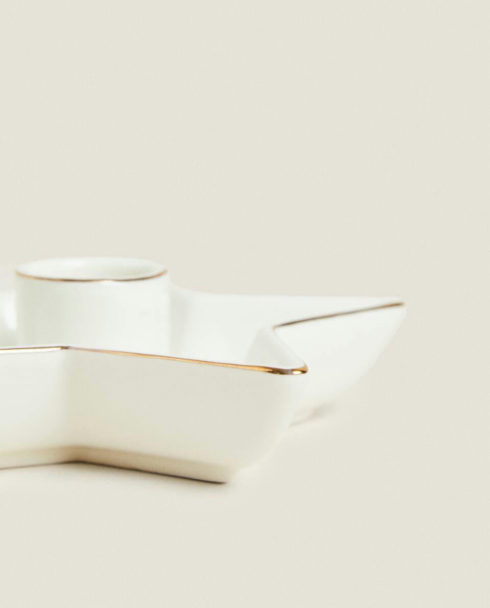 Porcelain candlestick, featuring a star-shaped base with a gold rim, for Christmas.