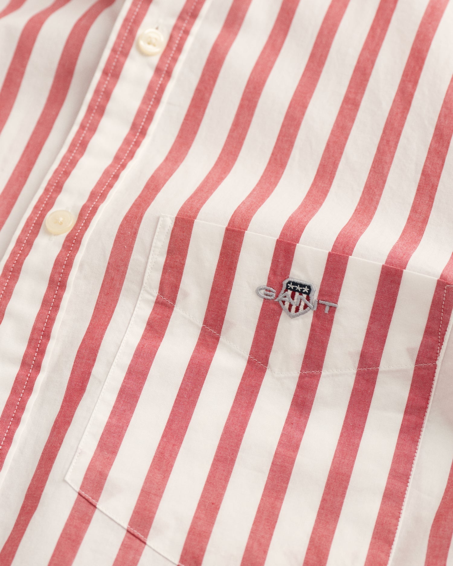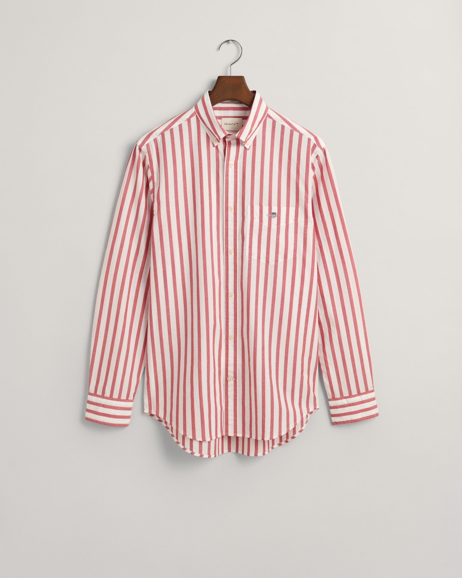 Crafted in a durable cotton poplin, this shirt is essential to any preppy wardrobe. Patterned with classic yarn-dyed stripes, this shirt is cut for a regular fit and features a button-down collar, curved hem and a box pleat with our signature locker loop at the back. It is accented with an '80s-inspired shield graphic embroidered at the chest pocket.