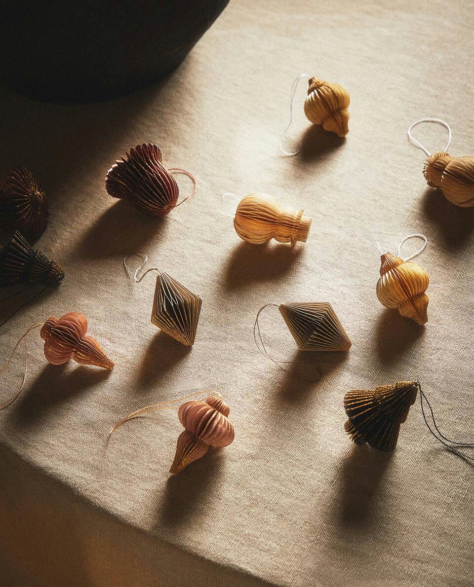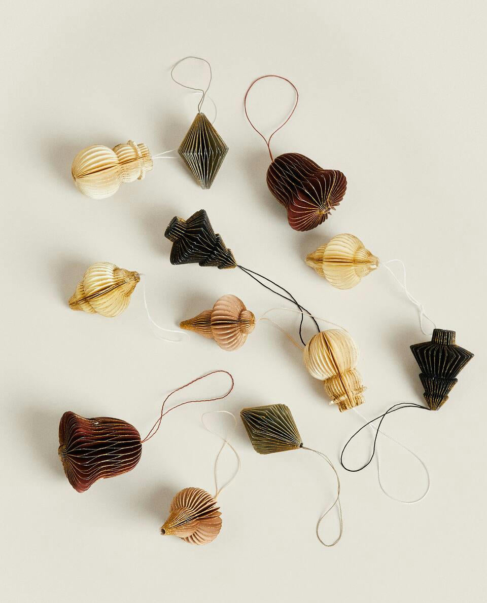 Paper Christmas tree decorations with 3D Christmas figures.The pack includes 12 decorations: 2 snowman-shaped, 2 Christmas tree-shaped, 4 lantern-shaped, 2 bell-shaped and 2 diamond-shaped decorations.
