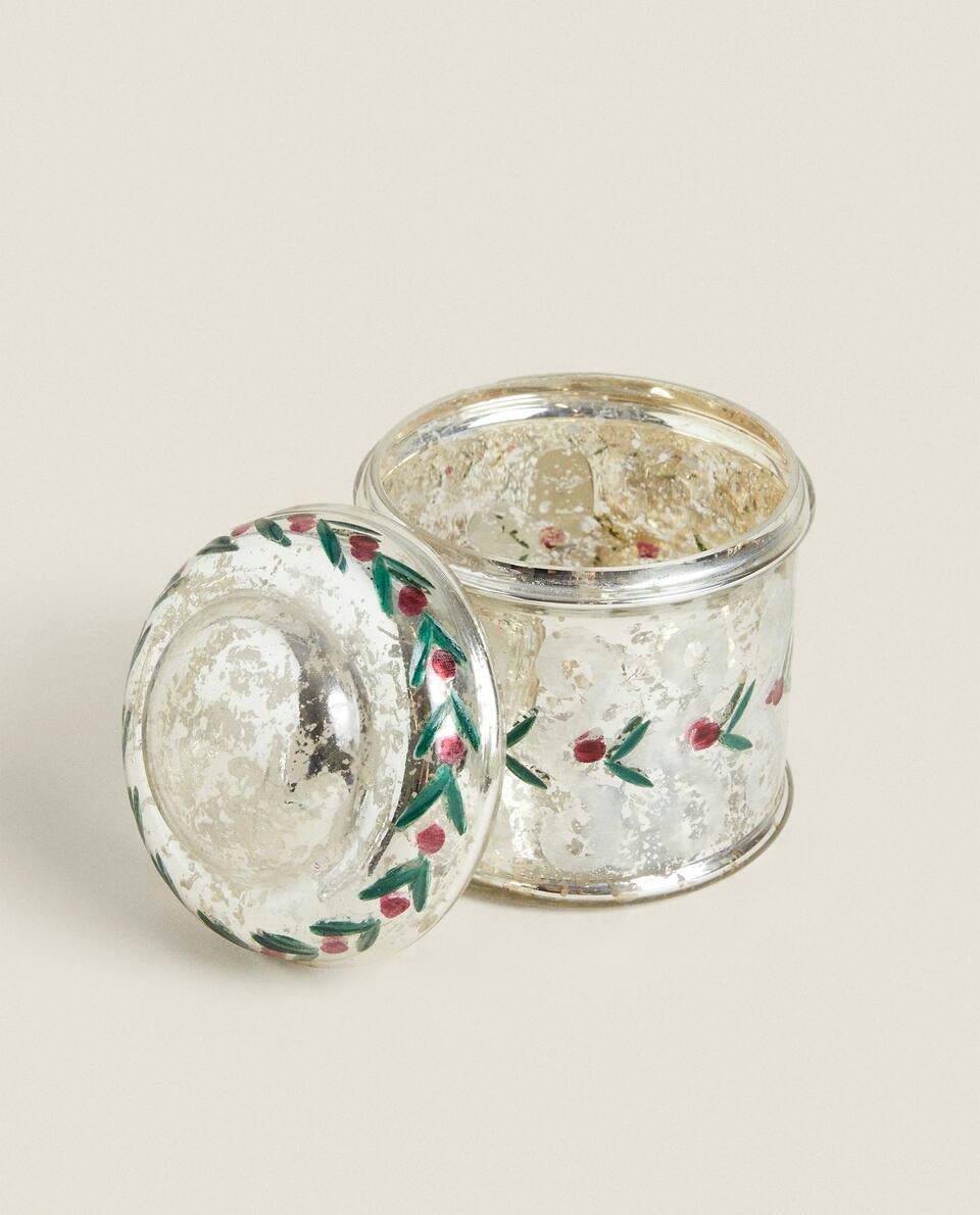 Round mercurised glass box with Christmas motifs.